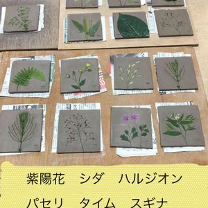 外は雨☔️ 自宅にある雑草やリーフを 使ってタイル作り☘🌿 上手くいくかな〜❓
