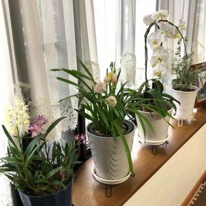 出窓の植物達 結構、広めの出窓に高さのある植物を置いているのですが、今回は前からあるのばかりです💕あまり形よくないです😃 シンピジュームも今二鉢だけ咲いていますが多少寂しい😔 胡蝶蘭は何とか2本で8個ずつ花が付いてます❤️💓 失敗ばかりでしたが何とか育っています。