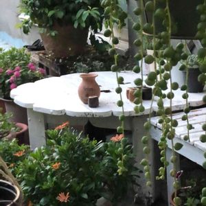グリーンネックレスのカーテンから、、花の少ないグリーン多めの今日のベランダ🌿🌿🌿