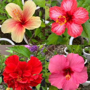 こんにちは😃 今日のハイビスカスさんです😊 左上から、アンイエロー、レッドマジック 左下は、レッドバルーン、ロングライフシリーズです☺️
