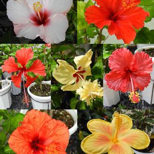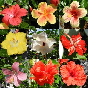 おはようございます😃☀ ハイビスカスさんたち、最低気温も上がり、よしゃ咲いたろかです😊 左上から、ヤングレディ、レインボー、フィジアンイエロー 左中から、レモンイエロー、常夏香りシリーズ、ハワイアンフラッグ 左下から、リリアン、赤八重、アジアの風シリーズです🤗