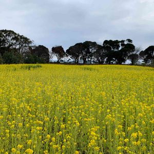 「満開になっていますよ❣️」💛💛💛 地元情報番組の中で紹介されていた "菜の花畑"...自宅から近いじゃないの! と寒風の中、見て来ました〜🥰 見上げる空は暗いんですが、、 一面の菜の花を眺めていると気分は すっかり🌼春🌼ルンルン🎶