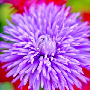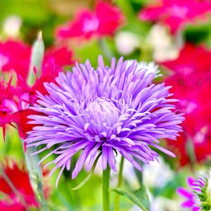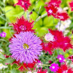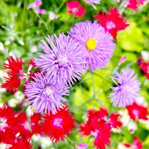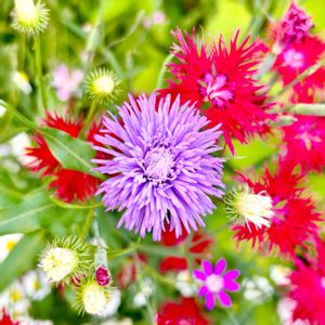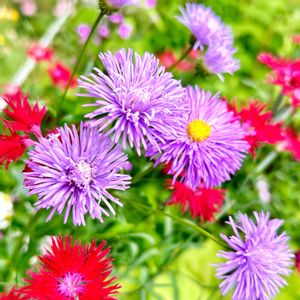 真っ赤な「カワラナデシコ」をバックに「エリゲロン アズール フェアリー」