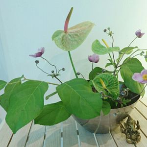 本日のサロンのいけばな。レモンリーフにアンスリュームと秋明菊を浮かべました。