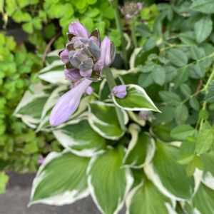 9月、夜長月の長月。私の散歩道の道際等の草花達は、熱さと強い日差しから解放されて、より充実した自己表現に向けて、その個性ある色彩をより長く放そうとしているようだ。 8月からの、そして熱さから解き放された草花たちの姿 ---その14。 /大きな白い覆輪葉、 花は紫のユリ似の穂状に咲く筒状花/ 盛夏は過ぎて、秋風が感ぜられ私の何時も散歩道の道際。 先に観たシュカイドウの目の先に、日陰の中に人知れずに、大きな葉に白い覆輪をはっきり付けているのが目に入る。 そして、その覆輪葉の株の中から、細い花茎を長く伸ばし、頂部の花序に大きいもので5cmはあろうか、沢山の花を穂状に咲かせていた。 それは、ユリの花に似た筒状の花色は紫であった。 ギボウシ(擬宝珠) --- 大型のギボウシ・パトリオットだろうか。 <‘ギボウシの名の由来等‘について、下記の「ギボウシ」より抜粋、次に: 花は短命な一日花である。「ギボウシ」の名前は、蕾、または若い花序の様子が、橋や寺社の欄干に取り付けられた飾りである擬宝珠(ぎぼし)に似ていることに由来する。> ・ギボウシ<擬宝珠、別名 ギンボ、タキナ、ウリイ、ホーライなど>(キジカクシ科 ギボウシ属/ホスタ属) (備忘: ギボウシの属性等について 7/29 ‘22)