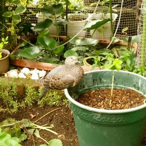 オクラの鉢でくつろぐ山鳩(^_^;)