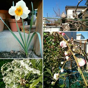 こんな所に水仙。 ブドウ棚に山鳩。 雪柳に花桃も開花\(^o^)/