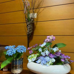お隣の玄関飾り 紫陽花たちが何種類いけてあるんだろう? 一番左の花瓶は、92歳のおばあちゃんの籐細工 粒々の紫陽花は、我が家の庭の紫陽花です💙