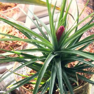 Tillandsia delicata イオナンタ似のツボ型に片足突っ込んでるチラ わかりづらいけど花序っぽいのが見える⁉️ 花序が出るってことはやっぱりデリカータなんだなあー 見た目はでかいイオナンタなのに💦