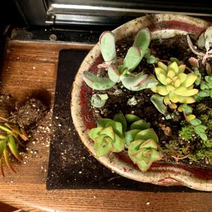 ちまちま寄せて昨年9/22に実家のにプレゼントした寄せ植えが上のpicです。(9/21picもあり) そして今日実家の洗面所で発見した同じ寄せ植えが下のpicです😣💦 大切にしてくれてたけど、床に落としてしまったそうで、慌てて土をぎゅうぎゅう戻した上にテンパったのか?水をたくさんあげてしまってました😱💦 乾燥してたら直せたけど、こんな悲惨な状態で埋められてたり折れてたりで😱 なんとか直してみるねって連れ帰ってきましたぁ😅💦 なんとかしてあげようと思います💦