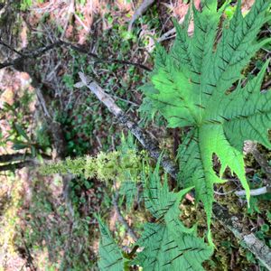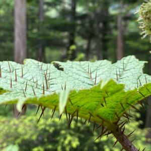 トゲトゲシリーズ② ❦ハリブキ❦ ウコギ科ハリブキ属落葉低木 雌雄異株 入笠湿原を超えさらに進んだ処にある大阿原湿原 木道の脇の鬱蒼とした日陰に異様な葉っぱ。 なんの因果で、こうも棘武装したのか🤔 2024.6/12