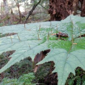 背丈ほどもあるデッカい株は、ハリブキです。若い果序をつけ始めてますね、熟すと真っ赤な果実になります😍 とにかく全体的に刺だらけ、大きな葉の表も裏も、葉柄も茎も、これでもかというほどの鋭い刺で覆われていて触ると痛い😣 草食動物に対する防御機構だけど、最近はなんでも食ってしまう🦌の食害もあるらしい…まだ若い株なのか?大きく育ったものなのか?は書いてなかったけど😓