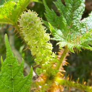 尾瀬 山の鼻↔︎鳩待峠 7/1 「ハリブキ」の花序が立ち上がっていました。ヤグルマソウに負けず劣らずでっかい葉なので、葉の影に隠れてしまいますが、秋になるとこの穂状のままに真っ赤な実を鈴なりにつけます😍 ご覧のように葉の表裏、茎を問わず鋭いトゲが密集しててさわるとマジで痛いです😅