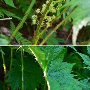 針蕗 はりぶき ウコギ科 ハリブキ属 花期 6月〜7月 草丈 1m 雌雄異株の落葉低木。 葉の表裏、茎に鋭いトゲが無数にあり触ったら・・・ これは鹿などの草食動物から身を守るため 葉は直径30〜40cmの掌状でフキの葉に似てないけど この名がついている❓ 緑白色の小さな花を多数つける。 秋に果実が赤く熟す。
