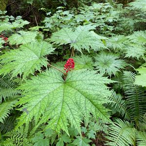 山はすっかり秋、夏の高山植物は影も形も無く、花は激減😂 雨中の山歩き🥾⛰ 道の脇に葉がちと尖ったフキみたいのがたくさん、これ前にもあげたハリブキです。葉の両面や柄、茎が痛そうな刺だらけ。鹿などの食害から身を守るためらしいけど、あいつらバラ🌹でも平気で食うからなぁ😅 というか食われた跡もない、不味いだけじゃないのか🤣 大きさは掌サイズから、顔の数倍はありそうな大きなものまで色々です。