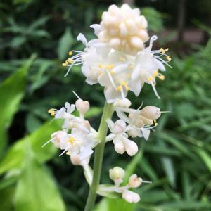 近所の境内に咲いていました。雨が降っていたので、この花の白が綺麗に映えていました。ラン系かな。