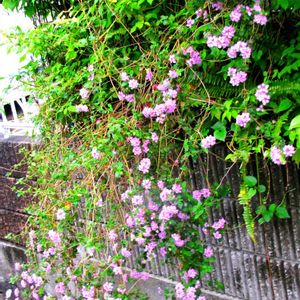 ❇️マンデビラ·白 白いマンデビラが、壁面を彩って目を奪われた👀 散歩道にて。道路より高台に住宅があり、高いブロック塀にネットをかけて、🤍白いマンデビラ🤍の蔓を這わせてあった。 ❤️赤いマンデビラ❤️も、少し覗いていた。 上の花は、小葉のランタナ·ピンク。