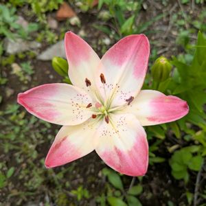 コミュニティ花壇 梅雨入りの最中、スカシユリのロリーポップの一番花が咲きましたよ~♪🤗💕✨ シュガーラブで投稿されていることが多いな~🙄 昨年は5月18日に開花したから一日早い‼️😆💕 近畿は昨日の5月16日に梅雨入り🌧️しました‼️ 昨年の梅雨入りは6月10日ですから…今年は25日も早~い😆💦