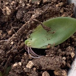 茎挿しに比べて葉挿しはなかなか出来ないと、ネットで読んだハムシー。 今年花が咲いた後、花茎を挿したら根づいた。😄 身代わりのように、本体の3本に増えた茎のうちの2本が、ボロボロ葉を落とした挙句に、枯れて元の1本に戻った。😥 生きている茎の根元には新芽が出ているから、まぁ、大丈夫かと。 で、本題。 ボロボロ落ちた葉を拾って、室内の窓際に置いておいたら、 なんと発根してた❣️)^o^( 上3つがハムシー。根だけのが2つ、葉だけのが1つ。 下は向かって左が、安定の発芽発根率、メイゲツ。 向かって右のがトプシーターヴィー❗️\(^o^)/ ちいっこい葉芽が出かかっているよ。😆 トプシーターヴィーって、英語で上を下への大混乱という意味だそう。 葉の反り方を指している。 海外ドラマ\(^o^)/『ブラウン神父』見てたら、ミセスブリジェット役がTopsy-Turvy! ってボヤいていた! この多肉植物を知らなかったら、聞き取れなかったはず。(^.^)😄 多肉のお愉しみはこんなところにもあった。(^◇^)😆