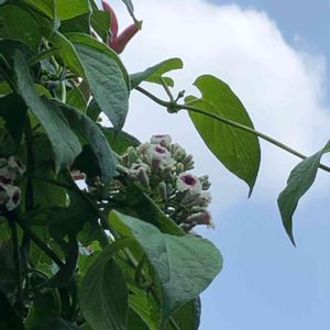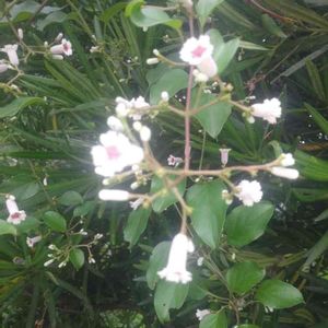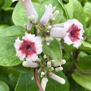 おはよう御座います👋😆✨☔ イヌマキの所にカズラが巻き付いて 綺麗な花が咲いてます😊💓 名前を教えて下さい🙇
