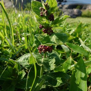フナバラソウ[船腹草] 別名 ロクオンソウ キョウチクトウ科カモメヅル属 2023.5.20 牧野公園にて 在来種で、絶滅危惧二類 真っ直ぐに立ち上がり、枝分かれしない草です。 1~複数段に黒紫色の星型の花が纏まって球状につき、ガガイモに似た袋果の形が舟腹に似ています。 北海道~九州に分布