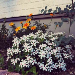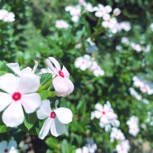 零れ種から咲いた日々草。一度元気がなくなったので切り戻しをしたらまた元気に❣️白が眩しい✨