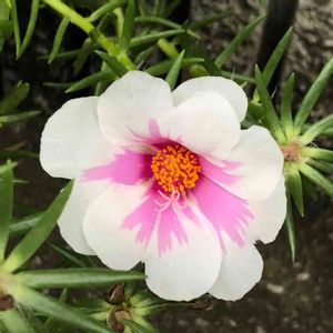 💗大輪マツバボタン💗 綺麗に綺麗に咲き出してます お花大きいんです 6〜7センチはあるでしょうか! 4〜5年前まではよく売られていましたが、ここのところちっとも苗を見かけませんでした 大好きで毎年お迎えしてましたが、タネ出来ない園芸種なんです 挿し芽で冬越ししないとです スベリヒユの種類は1日花で、朝開いて夕方には終わってしまうんですけど、ヒラヒラな花びら、真ん中くるりんのシベが可愛いんです💕 斑入りのお花にぞっこんです 今年、たまたま出会えて嬉しいなぁ😊
