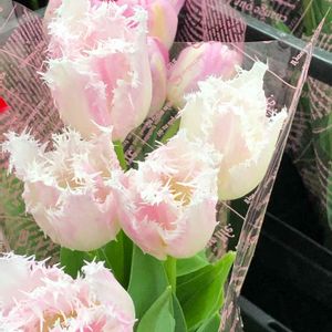 ほんのりピンクのギザギザチューリップ🌷 普段、切り花を飾ることがない我が家も、春を感じてウキウキです。