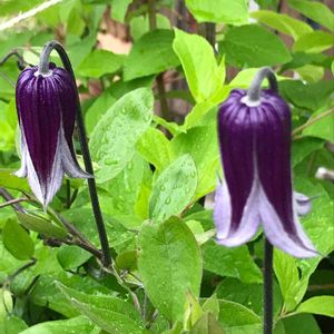 クレマチス 篭口 ピラミッドアジサイの新緑に濃い紫色が映えます