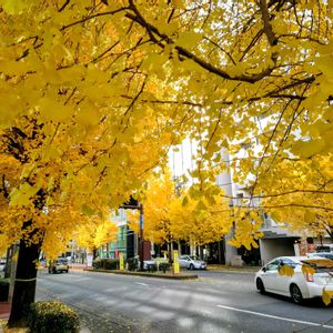2025/11/25撮影「銀杏」in 九州 雨があがると…銀杏並木の車道はまぶしいイエロー通りに変化する。