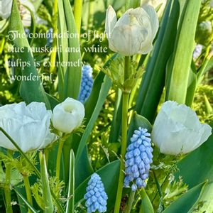 ムスカリと言えば紫の濃いやつを思い浮かべてしまいますが、最近は水色の可愛いムスカリも見かけるようになりましたね🩵 白いチューリップの組み合わせはなんとも素晴らしいです💖 お出かけ先で見かけてセンスの良さにとても感動しました🩷