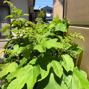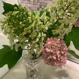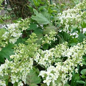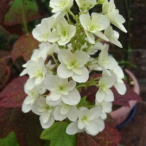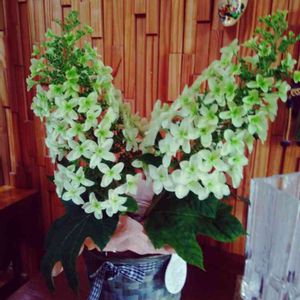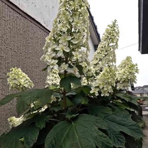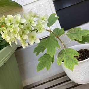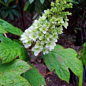 雨上がりの柏葉あじさい 駐車場工事のため切り詰めて移植してから初めての開花🎵ホッとしました💚 今は鉢植えだけど、前みたいに地植えが嬉しいかな…