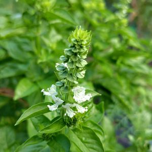 バジル💚🤍(ハーブ) 白くて小さな可愛いバジルの花が咲き始めていました。(姪🏡の庭で📱)
