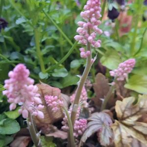 キュンキュン乙女椿倶楽部活動 🏷️ピーチピチばい 葉の色を楽しむヒューケラ 可愛いピンク色のツボミがあがってきました