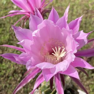 サボテン🌵 短毛丸が咲いてる😃 夕べ咲いたかな、長い首が垂れて重そう😆 ようやく夕べかなりの雨☂️が降り、今朝は全部の窓を開けて、空気の総入れ替え❗️ 🌱がぼうぼう…😆 少しずつ草むしりしなくっちゃ