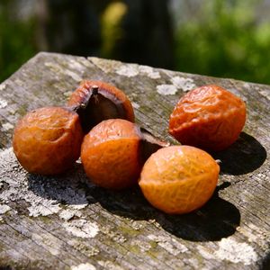 無患子の実 昔は石鹸のように使われたそうな 中の黒い種は数珠や羽子板の羽の重り 無病息災の御守りにも