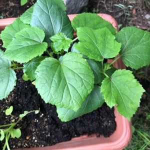 いつもの野菜 (大葉、茄子、きゅうり、つるむらさき、オクラ、ニラ)に、モロヘイヤも少しずつ採れるようになりました。
