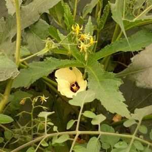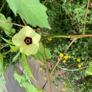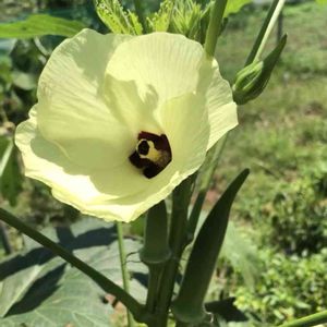 オクラ 大きな葉に隠れるように、咲いてる。 15センチ位。 綺麗なクリーム色の花。 花芯のエンジもいい色。 美味しく、滋養のある実を付ける。