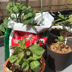 トマト、ピーマン、大葉に春菊 🍅支柱立てと誘引をしました 思った以上に生長が早いですね😆🔰