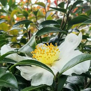 サザンカ 朝、庭をぐるり。「ここにいるよー」と言わんばかりの一輪見つけました🍀