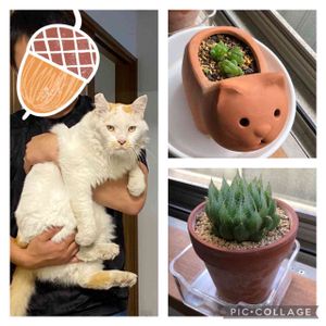 誕生日に 猫の植木鉢を貰いました❗️ それにオプツーサの子株を 植えました ↘️は名前がわかりません ハオルチア属 ⬅️娘夫婦が来た時に ムコ殿に抱っこしてもらった しろにゃん カメラ目線でパチリ📸
