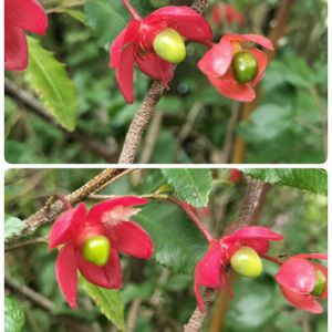 おはようございます😃 いわき市フラワーセンターにて 8️⃣ ①ハナキリン ②オクナ・セルラタ (別名,ミッキーマウスの木) ③シャクナゲ❤️ ④左上、カルミア 左下、ケストルム 右上、クジャクサボテン🌵 右下、ホザキノトケイソウ(蕾) ⑤アルピニア (別名、ゲツトウ(月桃)) 🏷️斑入り見つけ隊♪No.23 🏷️2のつく日は斑入りの日 🏷️真っ赤な火曜日 🏷️木に咲く花 🏷️青空っ子 参加します。