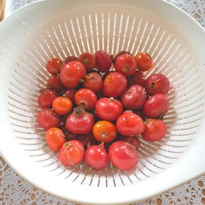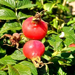 ハマナスの実(ローズヒップ) 直径2センチほどで一般的なバラの実より大きく、プチトマトのようにも見えてしまう。果肉は甘酸っぱくビタミンCを豊富に含む。