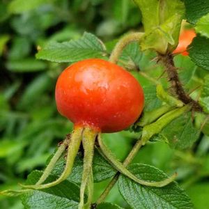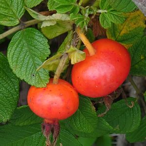 浜茄子 (ハマナス) バラ科 花が咲いてから2ヶ月ほどすると大きな実”ローズヒップ(=バラの実)”が成ります。ビタミンCはレモンの20倍。ポリフェノールも豊富で ピュレ・ジャムハーブティ・コーディアルなど食用として人気です。