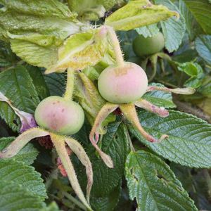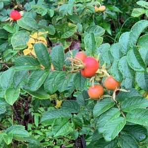 おはようございます♪ 早朝の雨☔️と⚡️雷凄かったですね 今は止んでます 🤍シロバナハマナスの実🤍 バラ科バラ属の落葉低木で海岸地方で良く見られ、花は香りが良く一日で散ってしまう儚さがあります。 浜茄子(ハマナス)の実(ローズヒップ)は食用になり、ローズヒップオイル、ジャム、香水etc. ネットより