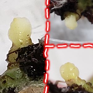 続・瀕死の斑入りデザートローズの経過🌱 3月26日に投稿した写真にも写っていたんですが、根元に白い突起がありました 「なんか大きくなって来た❓」と、まじまじと見ていたら何か平べったい🙄 気根や新しい根的な何かと思っていたんですが、新芽っぽい😳 赤ちゃん見ちゃったら、より助かって欲しい…と思ってしまう😣 早く土に植えたいけど、もう少し根がモジャってなってからにしよう(`=ω=)