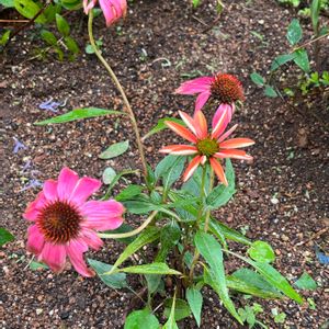 エキナセア 「あれっ?」 赤みが少しあるピンク 咲き進むにつれ 一つ違う感じで花が咲きました。 赤ぽいオレンジです! 花弁の形も明らかに違います。 そっと茎を覗いてみますが 一本ずっと地上に上がっています! これは要観察です😆
