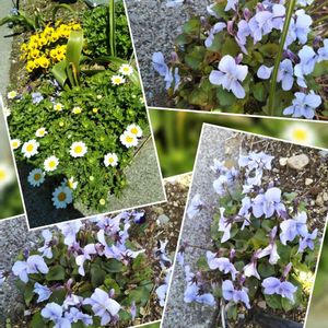 昼前の花壇からです💙💛🤗スミレ、ノースポール、ビオラが沢山咲き始めました💞