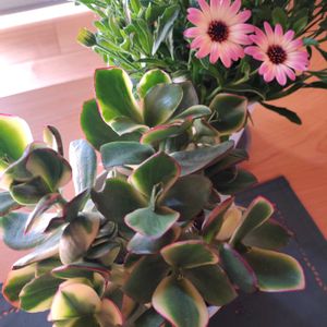 久しぶり2回目投稿です🥰 今日のお花が金のなる木だったので、うちの子たちをご紹介🥰 斑入りの金のなる木は玄関にいますが、寒いせいだかお花は咲きませんでした💦 リビングにいる金のなる木は今年は満開です🥰結構ながーく咲いてます🥰