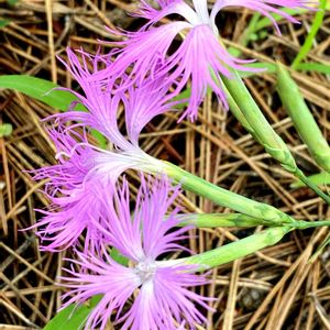カワラナデシコ ( 河原撫子 ) 薄暗い松林の中、松葉のクッションのあちこちに咲いてて、かなり目立ちました 秋の七草は空で言えません 女郎花、ススキ、桔梗、藤袴、葛、萩、そしてこの撫子 鑑賞するのに美しい植物を集めたそうですよ。